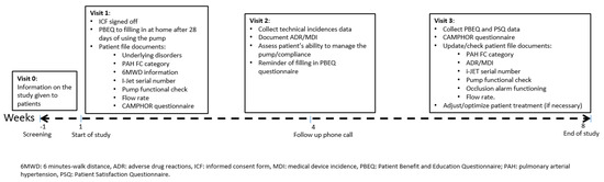 After screening (visit 0), the study consisted of 3 data collection visits: visits 1 and 3 were on site and visit 2 was a telephone call. At visit 1, the ICF was signed off; patients were trained on the use of the I-Jet infusion pump by a nurse; they took home basic information on the disease; the pump was provided; and clinical, demographic, and quality of life (CAMPHOR) data were collected. The PBEQ was provided and was to completed after 28 days of using the pump. After 1 month, patients received a follow-up telephone call to collect MDIs and ADRs, resolve technical issues, and assess the patient’s compliance and ability to self-manage the pump. A reminder to answer the PBEQ was given. Visit 3 (8 weeks) took place at the hospital and responses to the CAMPHOR questionnaire, PBEQ, and PSQ were collected. Moreover, pump functionality was checked and treatment was optimized if necessary (Figure 2). At the end of the study, the trainer nurse was invited to provide insights on the training experience in a 30 min, in-depth qualitative interview conducted by telephone (Supplementary Figure S4).