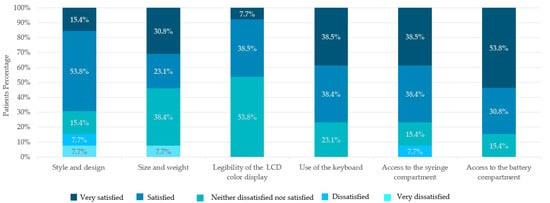 Regarding the style and design and size and weight of the I-Jet infusion pump, 9 (69.2%) and 7 (53.8%) patients were satisfied, respectively. A total of 10 (76.9%), 10 (76.9%), and 11 (84.6%) patients were satisfied with the usability of the keyboard, access to the battery, and access to the syringe compartments, respectively. A total of 53.8% of patients were neither dissatisfied nor satisfied with the legibility of the LCD color display (Figure 5).