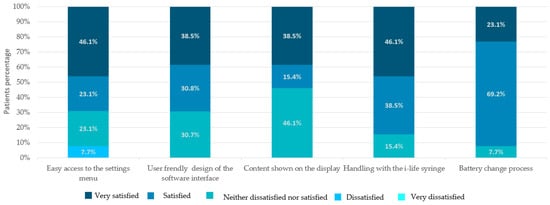 Patients were also satisfied with the easy access to the settings menu (n = 9, 69.2%); the user-friendly design of the software interface (n = 9, 69.2%); the content shown on the display (n = 7, 53.8%); the handling of the i-life syringe (n = 11, 84.6%); and the battery change process (n = 12, 92.3%) (Figure 6).