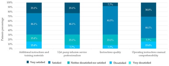 According to the responses, 9 (69.2%) patients were satisfied with the quality of the instructions, the training materials, and the overall I-Jet infusion pump service, while 10 (76.9%) patients were satisfied with the comprehensibility of the operating instruction manual (Figure 8).