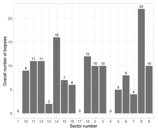 Notably, targeted lesions were located in apex in 24% of patients, in mid in 46%, and base in 30%. In 57% of patients targeted lesions were located in the posterior zone of the prostate and in 43% in the anterior zone of the prostate. Following collection of median 14 cores (IQR 12–16), 29% of patients had ISUP GG ≥ 2. The mean biopsy time was 31 min. Most biopsies were localized in sector 8 (22 out of 143 performed biopsies), which accounted for 15% of the respondents (Figure 1). None of the targeted biopsies involved sectors 1, 4, and 17.