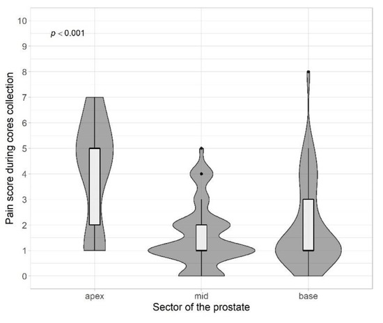 The obtained results of the statistical analysis assessing the difference between the region of the sample taken and the level of perceived pain clearly indicate that the most sensitive sector is the peak part (p < 0.001). The apex of the prostate is an extremely pain-sensitive site during biopsy due to the predominant presence of somatic nerves in the area below the dentate line. The result obtained by us coincides with the assumption of our work and conclusions published in the available literature [15,23,24,25]. Moreover, French researchers have shown that the first prick during a biopsy is the most painful for the patient. Therefore, they concluded that, because of the greatest sensitivity of the apical part of the prostate, it is recommended to start collecting biopsies from the base sector of prostate [23].