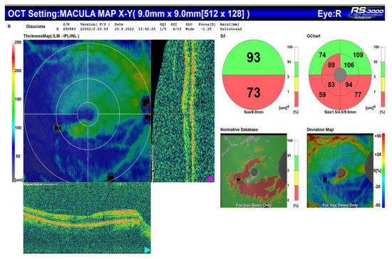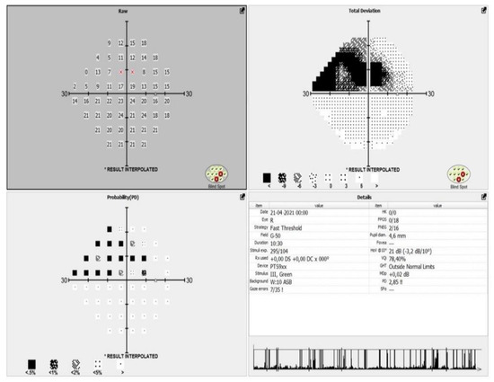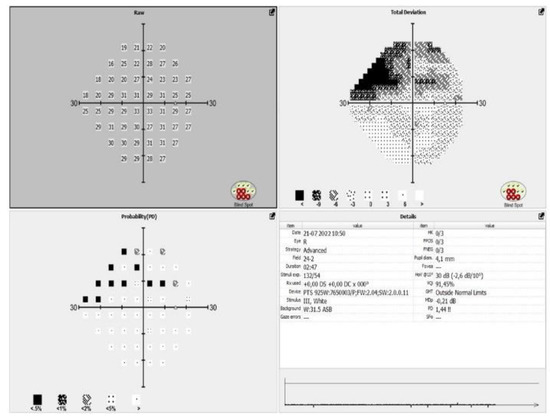 All the patients included in the study meet the criteria of European glaucoma society (EGS) for moderate glaucoma, according to their visual fields and optical coherence tomography (OCT) scans (Figure 1 and Figure 2).