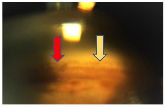 Gonioscopy view at 12 months. The area of ablation (yellow arrow) and the area of intact trabeculum (red arrow) are clearly visible.