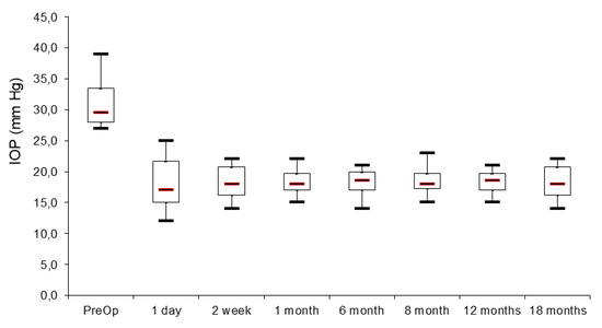 Figure 5 represents the preoperative intraocular pressure with maximal local therapy (timolol 0.5% 2×, dorzolamide 2× and brimonidine 2×). The local therapy was equal for all the patients included in the study. It shows also the achieved intraocular pressure (on the first day, 2 weeks, 1 month, 6, 8, 12 and 18 months).