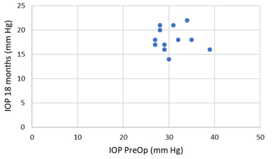 Figure 5 Scatterplot presents achieved intraocular pressure at 18 months post-intervention with administration of only one local medication for each patient (1–12).