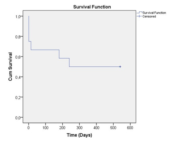All observed patients achieved 20% and more during the follow-up period. If we look for the IOP below 21 mmHg we have 3 patients with such achievement (Figure 6). The postoperative results showed stability over time–the treatment “success” rate is represented on Figure 7, using Kaplan-Meier graph.