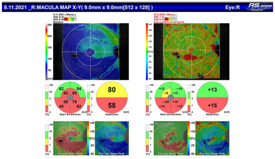 OCT of the same patient with corresponding arquate defect in the inferior half of the visual field.