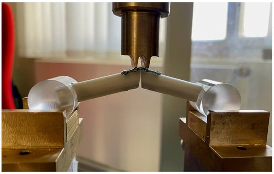 Using a universal testing machine (Zwick Z050®, Zwick GmbH & Co. KG, Ulm, Germany), tests were run in four-point bending. The extensions of the force conductor were positioned 3 mm proximally and distally from the arthrodesis site on the composite cylinders. The ends of the proximal and the distal specimen were inserted into acrylic cylinders (Figure 1). A cylinder was chosen to achieve compensatory rotational movement and a constant contact area during loading. After both composite cylinders were fused with one of the above-mentioned techniques, force was applied continuously at a rate of 100 mm/min in steps of 0.5° until a maximum of 10° flexion or extension was achieved, and the required force was recorded by a computer using testXpert III 1.1 software (Zwick GmbH & Co. KG, Ulm, Germany).
