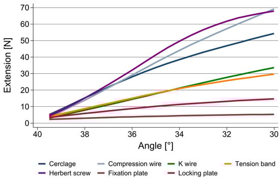 The analyzed data was the force necessary to achieve a bending of 10° either in flexion or extension. For each angle and technique, the mean extension and flexion forces over ten measurements in 0.5° steps were reported. For the angles 37.5°, 35.0°, 32.5° and 30°, differences in mean extension levels between the K wire and all the other techniques were tested using paired t-tests. For mean flexion levels, differences between the techniques for the angles 42.5°, 45.0°, 47.5° and 50° were tested. p < 0.05 was considered statistically significant. Furthermore, mean extension and flexion levels were plotted against all measured angles for each technique using a lowess smoother. The statistical analysis was performed using STATA 17.0 (Stata Corporation, College Station, TX, USA).