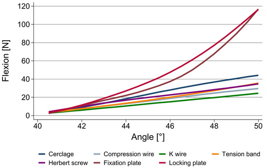 The cerclage as well as tension band technique and the compression screw provided good results in terms of their primary stability in extension as well as in flexion (Figure 2 and Figure 3).