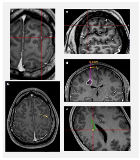 - Elias, W.J.; Sansur, C.A.; Frysinger, R.C. Sulcal and ventricular trajectories in stereotactic surgery. J. Neurosurg. 2009, 110, 201–207. [Google Scholar] [CrossRef] [PubMed]