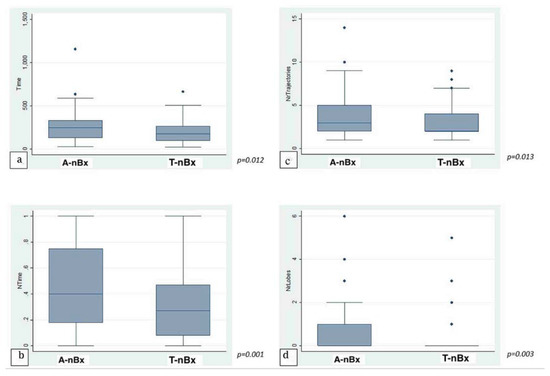 Trajectory enhanced nBx vs Anatomy-based nBx group—box-plot analysis. (a) Absolute time comparison (Y axis—time in seconds); (b) Normalized time comparison; (c) Trajectory changes; (d) Lobe changes. (NrTrajectories—Number of trajectory changes; NrLobes—Number of Lobe changes).