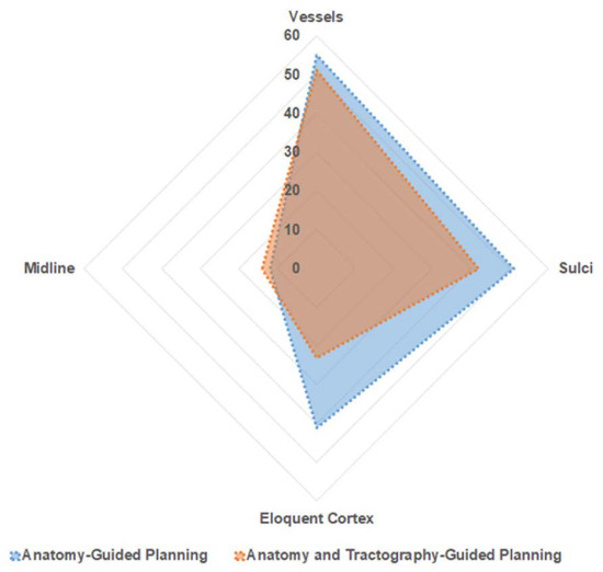 More trajectory changes were expected in the tractography group to navigate around the CST. However, tractography-enhanced planning had significantly fewer changes than in the A-nBx group (p = 0.01). The dilemma over the course of CST in A-nBx may be responsible for the increased trajectory/lobe changes [9,10,11]. Tractography explicitly demonstrates the relation between CST and a tumour, thereby being responsible for a more certain plan with fewer changes.