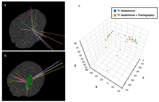 Proximity to midline and tractography. (a) Anatomy-based nBx—trajectories are scattered all over the hemisphere; (b) Tractography enhanced nBx—trajectories are pushed closer to midline in an intent to avoid CST; (c) Spatial representation of the cortical entry points of the different strategies based on X, Y and Z coordinates after definition of the line connecting the anterior and posterior commissures (AC-PC) and the middle commissural point (MCP).
