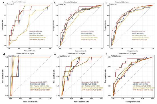 ROC curves for each prognostic scoring system to predict the RFS of patients with GISTs. (a) The 1-year ROC curves in the training set. (b) The 3-year ROC curves in the training set. (c) The 5-year ROC curves in the training set. (d) The 1-year ROC curves in the validation set. (e) The 3-year ROC curves in the validation set. (f) The 5-year ROC curves in the validation set.