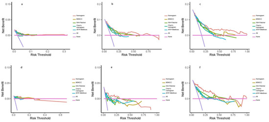 The DCA for each prognostic scoring system. (a) The 1-year DCA curves in the training set. (b) The 3-year DCA curves in the training set. (c) The 5-year DCA curves in the training set. (d) The 1-year DCA curves in the validation set. (e) The 3-year DCA curves in the validation set. (f) The 5-year DCA curves in the validation set.