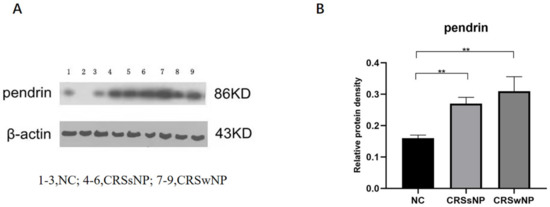 Pendrin protein expression in nasal samples revealed by Western blot (WB). (A) is the pendrin expression in tissuse, (B) is the density of (A) pendrin. ** represents p < 0.01.