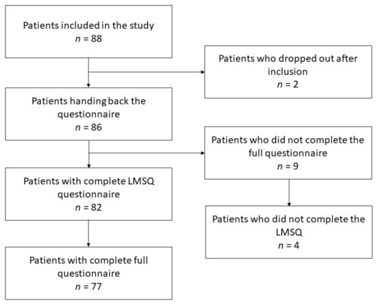 Additionally to the LMSQ, patients were also asked to provide information about their age, gender, native language, their migration background, their religion, their highest educational degree, their current employment status, and the number of members in their household for demographic purposes. The Scleroderma Health Assessment Questionnaire (SHAQ), the Compliance Questionnaire of Rheumatology (CQR), and the Health Literacy Questionnaire were also applied to assess associations between these patient-reported outcomes [28,29,30]. Nine patients did not fully complete their whole questionnaires, and out of those, four did not fully complete the LMSQ section of the full questionnaire. The patient recruitment process is illustrated in Figure 1. Since the various sections of the questionnaires could be evaluated independently, it was decided to include all participating patients, irrespective of the completeness for all clinical data.