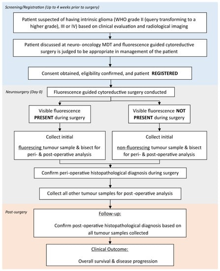 Patients were eligible if they were aged 16 years or older, had a WHO performance status (WHO PS) of 0 or 1, had radiological suspicion of an intrinsic glioma WHO grade II that was transforming to a higher grade or a suspected WHO grade III/IV tumour and had been reviewed by a specialist neuro-oncology multidisciplinary team (MDT) in which fluorescence guided cytoreductive surgery was judged to be appropriate.