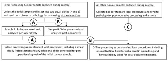 Patients with visible fluorescence during surgery had an initial sample of fluorescing tumour collected and bisected by the operating surgeon into two equal pieces with both pieces being sent to pathology at the same time during surgery to avoid spatial sampling bias. One piece was used for perioperative analysis and one piece for postoperative analysis as follows: