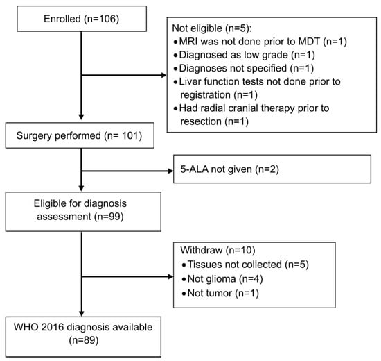These efforts allowed us to describe, in a real-world scenario, the reasons why a high proportion of initially enrolled patients were subsequently withdrawn: 17/106 (16%). Of these, 5/106 (4.7%) were deemed ineligible early after initial enrolment. In 2/106 (1.8%), 5ALA was not administered, and 10/106 were withdrawn postoperatively: In 5 patients, tissue was not collected, and 5 patients were deemed ineligible postoperatively after central neuropathology review. This information highlights the need for additional research nurse/technical support to assist with sample collection and emphasizes the value of good-quality sample collection.
