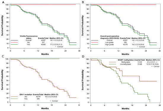 Overall survival in the eligible patients. Shown are Kaplan–Meier curves for overall survival. Tick marks indicate censored data. The survival time calculate from date of registration to date of death, censored if alive or lost to follow-up. (A) Overall survival of overall population and stratified by visible fluorescence; (B) Overall survival of overall population and stratified by post-operative diagnosis (2016 WHO); (C) Overall survival stratified by IDH-1 mutation status; (D) Overall survival stratified by MGMT methylation status. Two patients optout from study, the MGMT methylation status was not available for 6 patients.