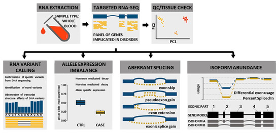 RNA-Seq was performed on RNA isolated from the blood samples of 77 individuals suspected to have dysferlinopathy or who had an incomplete genetic diagnosis (Supplementary Table S2). RNA-Seq has the ability to provide many different data points that can aid in the identification and clarification of variants, which can help to finalize a diagnosis (Figure 1). These include identification of splicing errors, potential structural variants (e.g., intragenic insertion–deletion events), and new variants, as well as determination of allelic phasing and inference of nonsense mediated decay (nmd) from allelic imbalance.