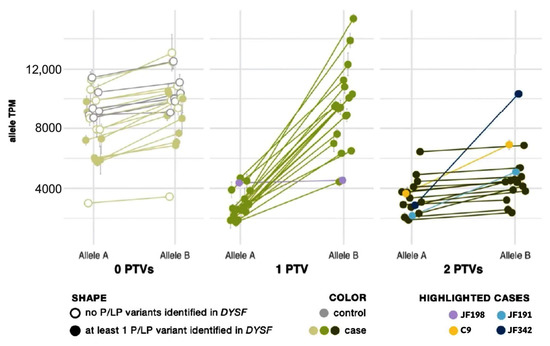 Protein-truncating variants (PTVs) such as nonsense and frameshift variants are commonly subject to nmd to prevent accumulation or protein translation of a nonfunctional or potentially deleterious transcript [38]. In previous studies, nmd has prevented some PTVs from being called in mRNA [39]. However, the extremely high read depth afforded by our targeted RNA-Seq panel, even without using any nmd inhibitor, allowed us to not only confidently call PTVs but also to use their presence to phase DYSF variants and confirm that two potentially causative variants are in trans without sequencing parents or offspring. As shown by Cummings et al. [32], the greater:lesser allele ratio in genes where a sample had one truncating single nucleotide variant (SNV) tends to be ~75:25. We observed the same trend in SNVs. We correlated this ratio with an overall transcript abundance of DYSF, showing that the differences in transcript abundance among these samples is predominantly a result of nonsense-mediated decay (Figure 2). The allele expression imbalance in samples with one truncating variant was so consistent across exons and samples that it could often be reliably used to phase variants.