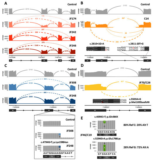 Examples of data that can be obtained from RNA-Seq analysis to aid in the diagnosis of dysferlinopathy. (A) Example of identification of exonic deletion: Sashimi plot of the exon skipping events seen in three patients (JF174, JF242, JF246). Subsequent genome sequencing (GS) identified the cause of the 2 different splicing events as a gross deletion encompassing exon 52. (B) Example of aberrant splicing events caused by intronic variants: RNA-Seq of C14 identified 2 different aberrant splicing events involving exon 26 caused by the destruction of the splice donor site by the c.2810+1G>A variant (left inset, red A indicates mutant variant) on one allele and the exon 27 extension caused by a novel branch point variant c.2811-20T>G (right inset, red G indicates mutant variant) on the other allele. (C) Example of leaky aberrant splicing event. Upper: Sashimi plot showing exon skipping caused by a leaky splice variant (c.4794G>T) at the end of exon 43 in JF308 and JF248. Inset: variant expression in a minority of reads (15–18%), which show a normal splice pattern but the presence of the missense variant (c.4794G>T; p.Lys1598Asn). (D) Example of missense variant acting as a splice altering variant: Sashimi plot of cryptic splice site variant c.5503A>G (inset, red G indicates mutant variant) in JF70/C26 that leads to a premature stop codon (p.Met1835LeufsX6) in the transcript. (E) Example of allele expression imbalance (AEI) observed in read pile-ups for JF46/C19 that can be used to confirm that the two variants of interest are in trans. In Sashimi plots seen in (A) through (D), solid lines indicate reference splicing, while dashed lines show observed aberrant splicing and values indicate the number of spliced transcripts.
