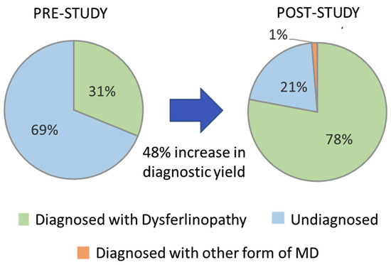 Despite the advances in DNA sequencing technology and the greater accessibility of genetic analysis due to the reduction in cost, a substantial number of individuals with probable dysferlinopathy remain without a definitive diagnosis after genetic sequencing. Only 31.2% of the individuals evaluated in this study had a definitive diagnosis of dysferlinopathy prior to subsequent analysis. This highlights the need for additional types of analyses to aid in obtaining a definitive diagnosis. This is especially true for autosomal recessive conditions such as dysferlinopathy, since the identification of two pathogenic variants in DYSF can be challenging due to the large number of rare DYSF variants identified and the difficulty in determining pathogenicity. As of September 2022, over 5274 DYSF variants have been submitted to ClinVar [44]. Many of these variants (40%) are labeled benign or likely benign (2112). For the remaining DYSF variants, only 1006 (19%) have been labeled as pathogenic, with 1616 (31%) listed as variants of unknown significance and another 540 (10%) having conflicting calls due to the use of different criteria for determining pathogenicity from the various submitters.