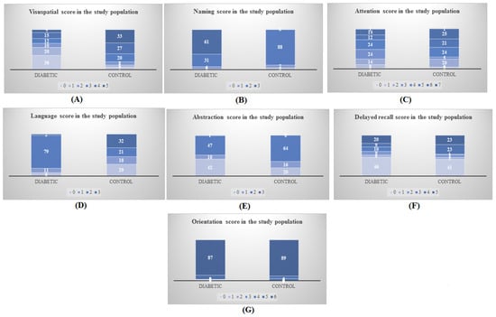 Subdomain scores in study subjects: (A) visuospatial score, (B) naming score, (C) attention score, (D) language score, (E) abstraction score, (F) delayed recall score, and (G) orientation score.
