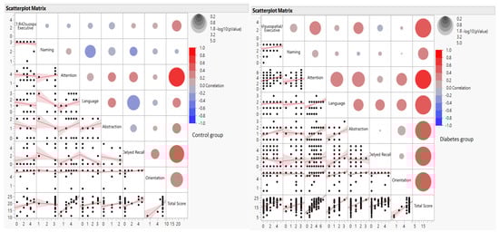 A multivariate correlation analysis was performed to determine the association between the total score (<25), indicating cognitive impairment, and the subdomain scores. Table 6 reveals a significant (p < 0.01) moderate-to-strong correlation (r = 0.4 − 0.7) between the total and the sub-domain scores in the diabetes group, indicating that the diabetic subjects with cognitive impairment (MOCA score < 25) also had poor subdomain scores. In contrast, the control group did not depict any relation between a subdomain and total cognitive scores. The scatter plot and bubble plot in Figure 2 show the degree of correlation between the various subdomains and total scores.