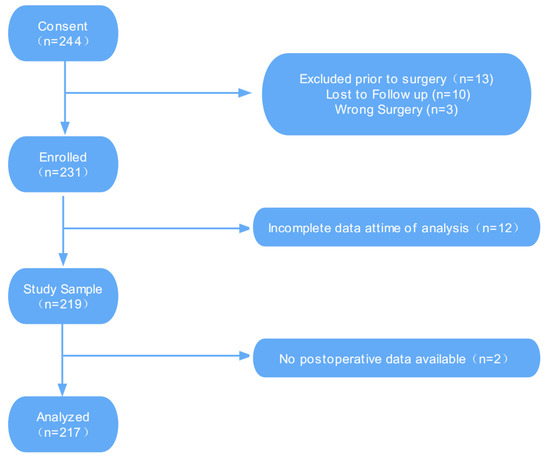 A total of 244 patients were recruited, of whom three underwent other types of surgery and 10 were lost to follow-ups. A total of 231 individuals were registered, of whom 12 had incomplete data at the time of analysis and two had no available postoperative data. As such, data from 217 participants was included in the final analysis (Figure 1).