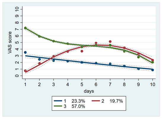 A total of 217 patients were used for the group-based trajectory analysis. In the entire sample, the mean daily pain score was moderate on postoperative day 1 (5.1 ± 3.1) and decreased significantly by postoperative day 10 (1.8 ± 1.0) (Figure 2). Table 2 reports the model fitting for the group-based trajectory analysis. The optimal number of trajectories and trajectory shapes are determined through group-based track modeling. The average posterior probabilities (AvePP) of the optimal model were closer to 1, and the Bayesian information criterion (BIC) value was relatively small. The best-fitting model included three trajectory groups: linear, quadratic, and cubic. These track groups are graphically illustrated in Figure 3.