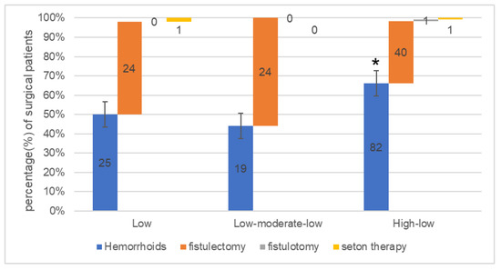 Hemorrhoids and anorectal abscess fistulas are the two most common types of benign perianal disease with a high incidence rate [1,2,3]. It has been estimated that 25% of British and 75% of American citizens will experience hemorrhoids at some point in their lives [4]. The incidence of anal fistulas is approximately two per 10,000 individuals per year [5]. Although benign perianal diseases are not fatal, delayed or inadequate treatment could lead to chronicity, impaired quality of life, and even serious impacts [1,2,6,7], such as perianal sepsis and colorectal cancer [5,8]. Surgery is the primary treatment for these two benign perianal diseases [9]. For patients with hemorrhoids, surgical resection can relieve symptoms faster (3.9 days for resection and 24 days with conservative treatment), and postoperative recurrence is low (one-year recurrence rate, 6.4%; conservative treatment, 25.4%) [10,11]. Surgery is also the first choice for patients with anal fistulas [12], with a cure rate of >90% [6,13].