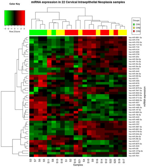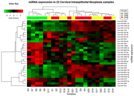 The overall trend of microRNA expression in human cervical intraepithelial samples in cervix bearing HPV infection as related to the severity of the intraepithelial neoplasia (CIN 1–3) was determined by heatmap analysis (Figure 1).