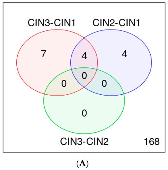 No statistically significant differences were found in CIN 3–CIN 2 groups (Figure 3A). Four miRNAs (miR-4485-5p, miR-4485-3p, miR-4497, miR-4507) are commonly down-regulated among CIN 3/CIN 2 group compared to CIN 1 group (Figure 3A).