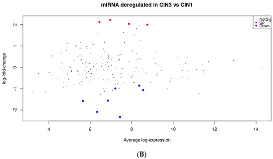 (A) Venn diagram analysis illustrates the relationships of statistically significant deregulation of microRNAs in the various CIN sets; the red circle shows a total of eleven significantly deregulated microRNAs between CIN 3 and CIN 1, of which four (intersection of red and blue circle) shared to those deregulated between CIN 2 and CIN 1 to which four microRNA exclusively belong (blue circle without intersection); however, no significant deregulation was found between CIN 3 and CIN 2 group (green circle). There are 15 significantly altered microRNAs. (B) Mean difference plot of deregulated microRNAs between CIN 3 versus CIN 1 seven blue and four red highlighted points correspond to the significantly altered microRNAs.