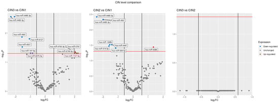 Volcano plot analysis underlines the expression of microRNA from left to right the volcano plots of deregulated miRNA in group differences: CIN 3 vs. CIN 1, CIN 2 vs. CIN 1 and CIN 3 vs. CIN 2. Vertical black lines represent a |log2(FC)| > 0.6 and the red horizontal line shows an adjusted p-value < 0.05. Blue and red dots are miRNAs down- and up-regulated, respectively.
