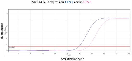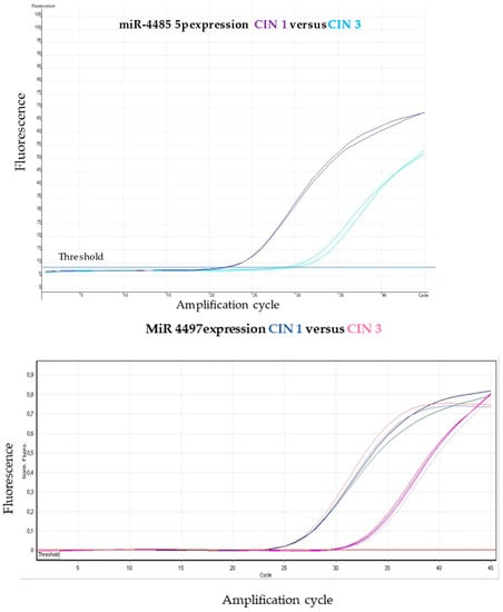 The qPCR validation of miRNA microarray data is reported in Figure 5 in which the amplification curves for each sample, either CIN 3 (light blue) or CIN 1 (purple). The relative miRNAs expression intensities were: (a) miR-4485 3p, 2.7 + 1.4 in CIN 3 and 5.6 + 2.6 in CIN 1 (p < 0.05); (b) miR-4485-5p 1.9 + 1.2 in CIN 3 and 4.6 + 1.3 in CIN 1 (p < 0.05); and (c) miR-4497 1.2 + 1.4 in CIN 3 and 3.4 + 1.9 in CIN 1 (p < 0.05). This pattern resembles the microarray-detected 1.5-fold down-regulation in CIN 3 as compared to CIN 1 (see Figure 2).