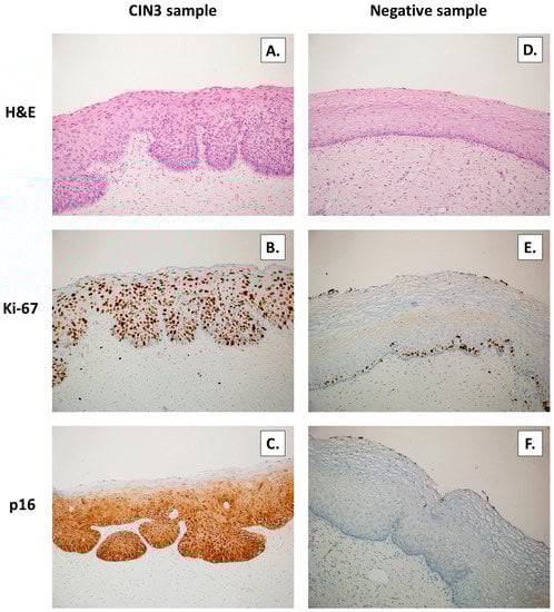 - Kalof, A.N.; Cooper, K. p16INK4a immunoexpression: Surrogate marker of high-risk HPV and high-grade cervical intraepi-thelial neoplasia. Adv. Anat. Pathol. 2006, 13, 190–194. [Google Scholar] [CrossRef] [PubMed]