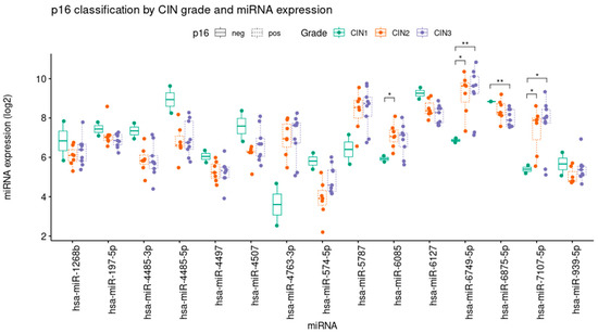 Expression levels of the 15 deregulated miRNA classified for CIN level and p16. miR-6085, miR 6749-5p, miR 6875-5p and miR-7107-5p differences in positive p16 and negative p16 are statistically significant. Histograms depicts the quantitative data of means + SE of positive p16, p < 0.05 vs. p16 negative samples. * p < 0.5, ** p < 0.05.