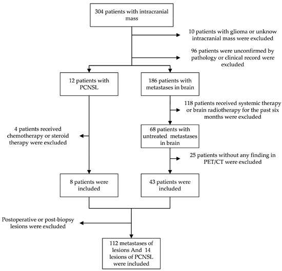 The study retrospectively reviewed patients with intracranial mass who received an 18F-FDG PET/CT at Jiangsu Cancer Hospital from May 2016 to May 2022. Patients with PCNSL confirmed by pathology and brain metastases confirmed by pathology or clinical history without receiving systemic therapy or brain radiotherapy for the past six months. Due to patients’ compliance, the biopsy of brain metastases cannot be feasible for all the patients whose primary tumor was pathologically confirmed. All the lesions were not postoperative or post-biopsy (Figure 1).