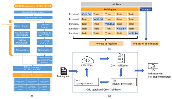 Fit the model and internal cross-validation. (a) The schemes of establishing the estimators. (b) The datasets were split into the training set and the testing set. The training set was divided into five folds for training and cross-validation. (c) The hyperparameters with the highest precision score in cross-validation were chosen.