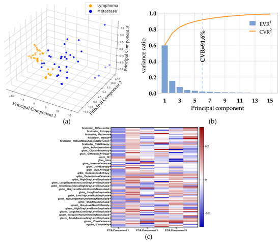 The result PCA. (a) The data of the first three principal components in the multi-class features group training set. (b) The individual-explained variance ratio and cumulative-explained variance ratio for each principal component. (c) The heat map shows a matrix of the PCA loading vectors.1 EVR: individual-explained variance ratio. 2 CVR: cumulative-explained variance ratio.