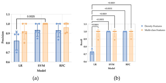 The precision between different models (p = 0.0137) and between datasets (p = 0.0174) are discrepant. In multiple comparisons between values of precision, only the difference between the SVM model trained by multi-class features and the LR model trained by density features is observed (p = 0.0025). The recall of the LR model trained by density features is lower than the others (p < 0.0001), while there is no difference was found between the others (Figure 4).