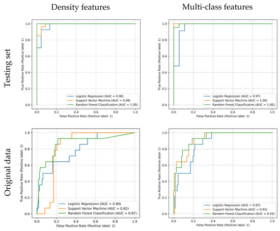 For the five sixths estimators, the F1 scores resulting from the testing set are more prominent than 0.9. The result indicated that precision and sensitivity could be excellent in the testing set. ROC and AUC can also display similar results. In order to evaluate the predicted performance in the real world and the generalization ability of the estimators, we used the original data sets (without resampling) to re-evaluate all estimators. We noticed that all estimators’ F1 scores or AUCs have a decrease in a certain degree tested by original data sets (without resampling) while considering the class imbalance. Especially in the RFC model trained by density features, the F1 score is 1.00 in the testing set and decreases to 0.82 in the original data. We conjecture that overfitting this estimator may decrease the estimators’ performance, as reported [45].On the other hand, the estimator generated from the RFC model trained by multi-class features performs well for both the testing data set and the original data set (without resampling). We conjecture that the characters of the random forests algorithm decrease the possibility of overfitting. Because the random forests deal with the problem of overfitting by creating multiple trees, with each tree trained slightly differently, it overfits differently. The sufficient diagnostic information provided by the multi-class features and the combination of each decision tree offset the effect of overfitting each decision tree.