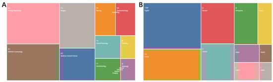 Most of the papers on perineal pain are clinical studies for which the research focus was mainly urology/nephrology and obstetrics/gynecology. Articles published in the French language were also frequently identified, which is due to the abundance of papers published in Progres en Urologie (Figure 3A,B). These results also reflect the importance of French research institutions and scholars in the field of perineal pain research.