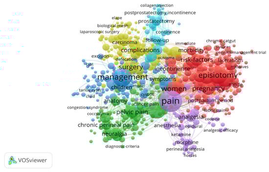 Using the VOSviewer software, we identified keywords that appear most frequently in studies of perineal pain. We analyzed papers to identify keywords that were listed in at least five studies. Of 6010 words identified overall, 531 met this threshold. Figure 4 shows that the 531 words could be classified into seven clusters: episiotomy, pain, management, prostatectomy, surgery, pelvic pain, and complication. From these results, we conclude that research on perineal pain is focused on clinical studies and that pain after surgery is a key focus. There is a marked lack of research on unexplained perineal pain.